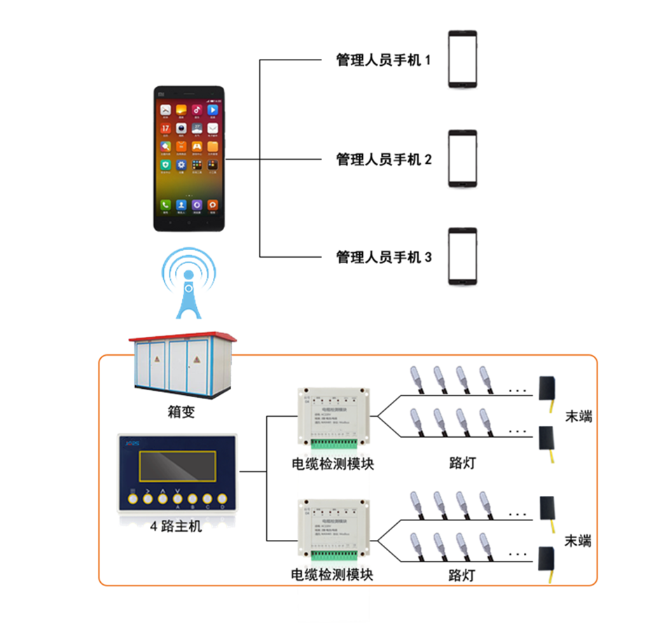 9. 電纜防盜報警,電纜被割斷、變壓器配電柜非法開門時,發(fā)出報警,可迅速確定報警位置和故障電纜,全天候24小時監(jiān)控,白天路燈電纜無電時也可監(jiān)控。