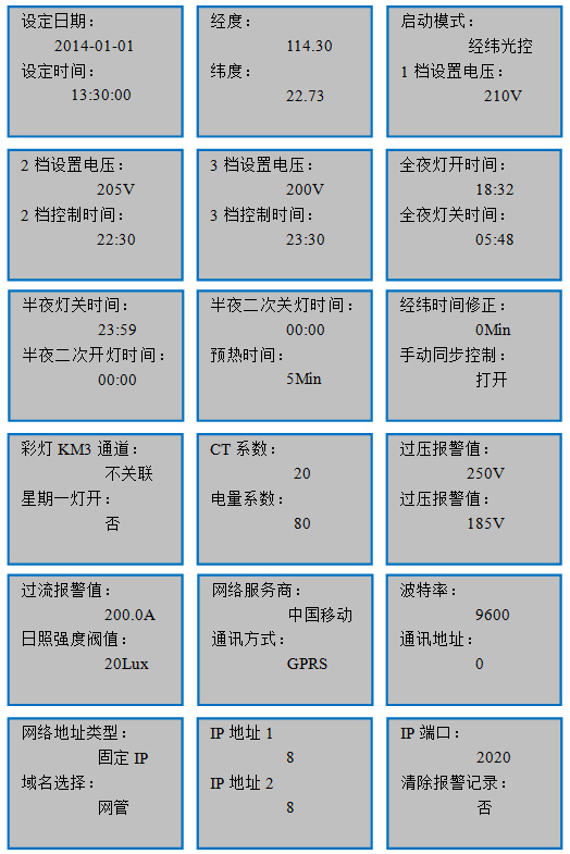 參數(shù)設(shè)置說明:按Enter進(jìn)入“參數(shù)設(shè)置”,再按Enter進(jìn)入驗證密碼:000001,進(jìn)入?yún)?shù)設(shè)定界面,如需設(shè)置時間:把光標(biāo)移到“設(shè)定時間”上,按Enter,光標(biāo)閃爍,這時可以按上下左右鍵設(shè)定時間,設(shè)定后按Enter確認(rèn),按Esc退出。注:當(dāng)啟動模式選用經(jīng)緯光控時,光控優(yōu)先起動,系統(tǒng)會自動生成每天的開關(guān)燈時間,開關(guān)燈時間不能直接調(diào)整,應(yīng)通過“經(jīng)緯時間修正”來修改開關(guān)燈時間,-為時間提前, +為時間滯后。