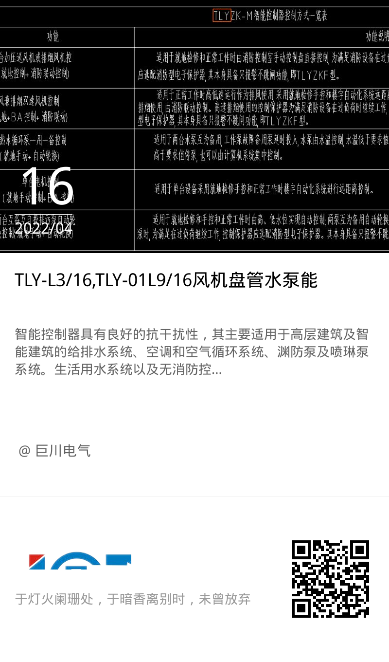 TLYZKF型集中節(jié)能控制器具有良好的抗干擾性,其主要適用于高層建筑及智能建筑的給排水系統(tǒng)、空調(diào)和空氣循環(huán)系統(tǒng)、消防泵及噴琳泵系統(tǒng)。生活用水系統(tǒng)以及無(wú)消防控制中心的小高層鄰層聯(lián)動(dòng)系統(tǒng)。TLYZK-F動(dòng)力消防型控制器控制與保護(hù)開(kāi)關(guān)電器:采用的操作機(jī)構(gòu),配與其它模塊實(shí)現(xiàn)了故障時(shí)”只報(bào)警,不跳閘”和短路時(shí)”報(bào)警+跳閘”的獨(dú)特功能.能效集中控制器適用于排風(fēng)兼排煙風(fēng)機(jī),正壓風(fēng)機(jī),雙速風(fēng)機(jī),消防栓泵,噴淋泵,穩(wěn)壓泵等.TLYZK-M系列集中節(jié)能控制器與傳統(tǒng)的分離元件組成系統(tǒng)的雙速控制器:以TLYZK-M作為主開(kāi)關(guān),與接觸器,電氣聯(lián)鎖等附件組合,構(gòu)成雙速控制器CPS. 138適用于就地檢修和正常工作時(shí)由消防控制室手動(dòng)控制盤(pán)直接控制,為滿(mǎn)足消防設(shè)備在過(guò)負(fù)荷時(shí)繼續(xù)工作,控制保護(hù)器應(yīng)配消防型電子保護(hù)器,其本身具備只報(bào)警不跳閘功能。TLYZKF-M/-215適用于正常工作時(shí)高低速運(yùn)行作為排風(fēng)使用,采用就地檢修手控和樓宇自動(dòng)化系統(tǒng)遠(yuǎn)距離控制,高速也可以作為排煙使用,由消防聯(lián)動(dòng)控制。高速排煙使用的控制保護(hù)器為滿(mǎn)足消防設(shè)備在過(guò)負(fù)荷時(shí)繼續(xù)工作,控制保護(hù)器應(yīng)選配消防型電子保護(hù)器,其本身具備只報(bào)警不跳閘功能。TLYZK-M/-272適用兩臺(tái)消防互為備用,一用一備控制。
