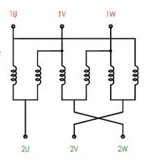 Y/YY接線的主回路與△/YY接線相同,見圖4所示。對于倍極比變極,在繞組改接時,也應(yīng)把接到電動機端頭電源的次序進行相應(yīng)改變。Y/YY接線的繞組接線關(guān)系見圖7所示。