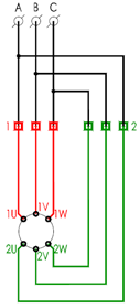 對常用的接線方式進行有針對性分析,△/YY、Y/YY接線較為常用,且二者主回路相同,容易混淆,故本文主要對這兩種接法進行技術(shù)分析,對Y/Y接線進行簡要說明。為了便于比較,△/YY、Y/YY接線均以4/2極數(shù)比進行模擬分析。