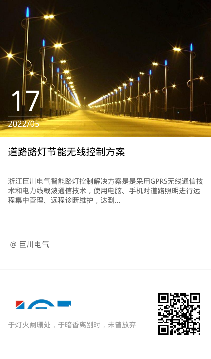 浙江巨川電氣智能路燈控制解決方案是是采用GPRS無(wú)線(xiàn)通信技術(shù)和電力線(xiàn)載波通信技術(shù),使用電腦、手機(jī)對(duì)道路照明進(jìn)行遠(yuǎn)程集中管理、遠(yuǎn)程診斷維護(hù),達(dá)到路燈智能化監(jiān)控、提高管理效率、降低維護(hù)費(fèi)用和節(jié)約能源的功效。