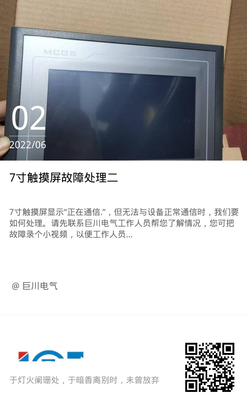 7寸觸摸屏顯示“正在通信.”,但無法與設(shè)備正常通信時,我們要如何處理。請先聯(lián)系巨川電氣工作人員幫您了解情況,您可把故障錄個小視頻,以便工作人員快速幫您排查故障。您可參考前文:智能照明7寸彩色觸摸屏故障處理一。