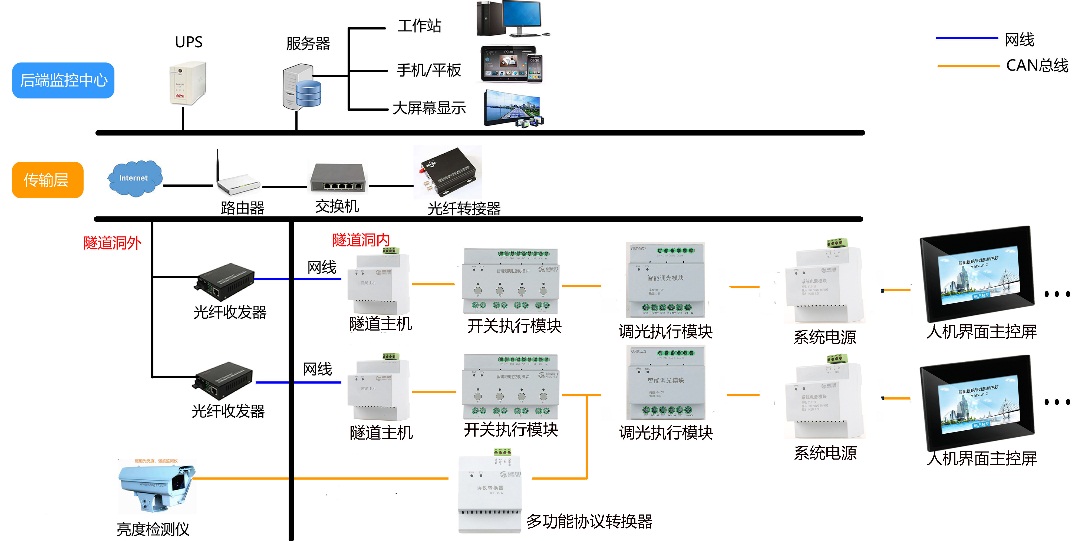 (1)系統(tǒng)原理系統(tǒng)主要由洞外亮度檢測儀、洞內(nèi)亮度檢測儀、隧道照明集中控制器、調(diào)光控制柜、亮度可控型公路隧道LDE照明燈具、傳輸設(shè)備和照明管理軟件等組成。系統(tǒng)的洞外亮度檢測儀將檢測到的隧道洞外亮度信號轉(zhuǎn)換為 4~20mA標(biāo)準(zhǔn)信號通過KYJYP-4*1. Omm2信號電纜傳送至隧道洞口變電所調(diào)光控制柜內(nèi):系統(tǒng)的洞內(nèi)亮度檢測裝置將檢測到的隧道洞內(nèi)入口段、出口段和中間段亮度信號轉(zhuǎn)換為 4~20mA 標(biāo)準(zhǔn)信號傳送至隧道洞口變電所調(diào)光控制柜內(nèi)。 設(shè)于調(diào)光控制柜內(nèi)的隧道照明集中控制器根據(jù)桐內(nèi)外亮度,分別計(jì)算出入口各段加強(qiáng)照明和基本照明相應(yīng)地調(diào)光 功率,再將其分別轉(zhuǎn)為直流模擬信號輸出,去控制加強(qiáng)照明燈具和基本照明燈具的輸出功率, 進(jìn)而控制燈具亮度的變化。 照明集中控制器利用網(wǎng)線,通過變電所 PLC 處工業(yè)以太網(wǎng)交換機(jī)上 傳至隧道管理站新設(shè)隧道照明管理軟件,實(shí)現(xiàn)數(shù)據(jù)傳輸。 隧道管理站可通過隧道照明管理軟件, 實(shí)現(xiàn)相關(guān)參數(shù)的設(shè)定、指令下達(dá)、實(shí)時(shí)信號讀取和儲存,完成隧道照明調(diào)光控制。 通訊中斷時(shí), 控制器應(yīng)能自行根據(jù)洞外亮度等參數(shù)自動(dòng)進(jìn)行調(diào)光。 隧道照明管理軟件搭載在隧道管理站工作站上,可在工作站上作為獨(dú)立管理軟件使用,同時(shí)預(yù)留接口協(xié)議,可接入至隧管站監(jiān)控系統(tǒng)應(yīng)用軟件,作為應(yīng)用軟件于模塊使用。
