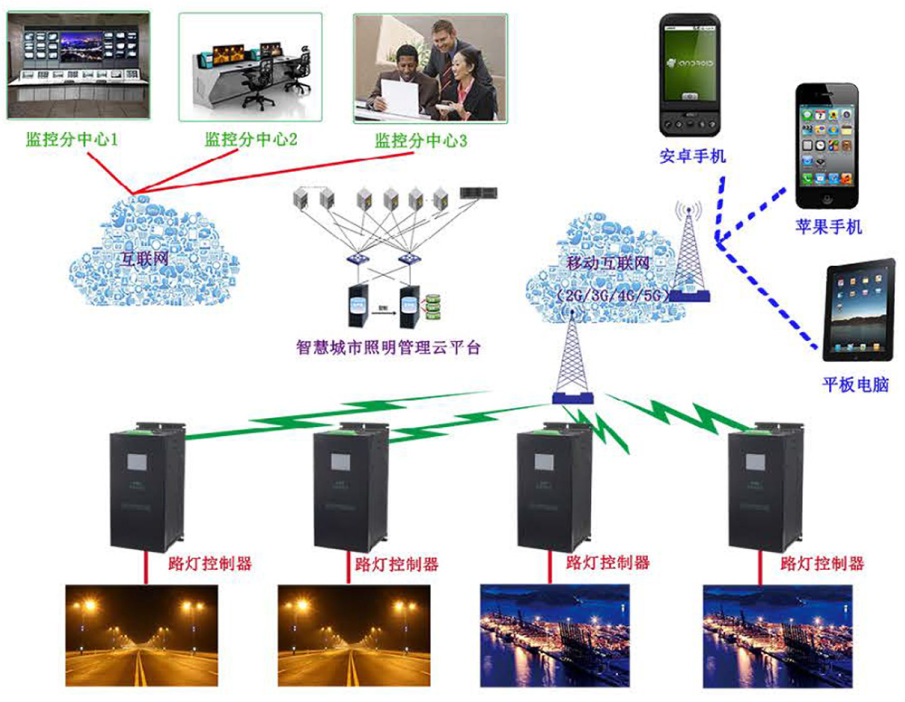 本工程照明動態(tài)穩(wěn)壓節(jié)能遙控裝置擬采用照明監(jiān)控系統(tǒng)實(shí)現(xiàn)照明設(shè)備的統(tǒng)一監(jiān)控, 提高照明系統(tǒng)的工作質(zhì)量和工作效率,方便照明系統(tǒng)的運(yùn)行、維護(hù)、擴(kuò)展等,使照明運(yùn)行管理水平邁上新的臺階。照明動態(tài)穩(wěn)壓節(jié)能遙控裝置可擴(kuò)展照明遠(yuǎn)程監(jiān)控系統(tǒng)由外部照明遠(yuǎn)程控制終端(RTU)、 無線數(shù)據(jù)通訊系統(tǒng)、監(jiān)控中心組成,實(shí)現(xiàn)燈具三遙監(jiān)控(遙測、遙控、遙信)。在每個(gè)配電箱內(nèi)裝設(shè)RTU來控制燈具的開閉,通過RTU可實(shí)現(xiàn)燈具的時(shí)控/遠(yuǎn)控、各種電氣參數(shù)采集、遠(yuǎn)程抄表等功能及與監(jiān)控中心的遠(yuǎn)程通信。時(shí)控模式下,RTU 根據(jù)設(shè)備所在位置經(jīng)緯度和地球自轉(zhuǎn)、公轉(zhuǎn)規(guī)律所計(jì)算出的日出日落時(shí)間自動控制路燈的開閉。遠(yuǎn)控模式下,可在控制中心通過GPRS無線數(shù)據(jù)通訊向RTU發(fā)送遠(yuǎn)程指令實(shí)現(xiàn)燈具的開閉控制。