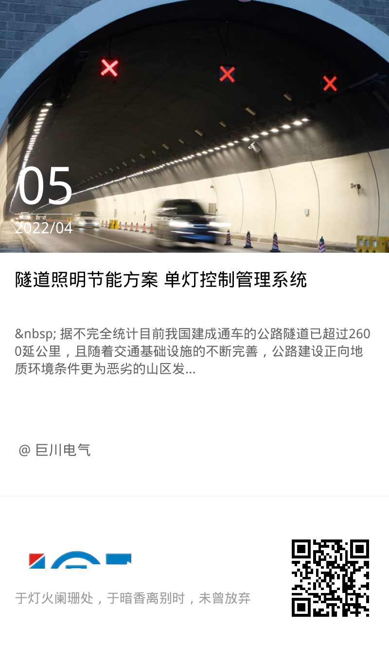 節(jié)能降耗、保障安全是建設(shè)和運(yùn)營單位迫切需要解決的技術(shù)難題。巨川電氣科技隧道單燈智能照明控制系統(tǒng)可以節(jié)省電量的損耗,同時(shí)改善隧道內(nèi)視覺享受,減輕駕駛員疲勞,有利于提高隧道通行能力保證交通安全。